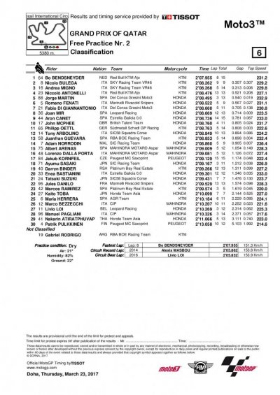 Anche Niccolò Antonelli ha assaggiato l’asfalto di Losail, per fortuna senza danni; il compagno di squadra di Bendsneyder è risalito in sella ed ha stampato il quarto tempo in 2’08.476, a circa mezzo secondo dalla vetta. Dopo lo spagnolo Jorge Martin, altri due italiani: Romano Fenati, sesto con la Honda Snipers e Fabio Di Giannantonio, settimo in sella alla Honda di Gresini. I loro ritardi dal migliore sono compresi tra il mezzo secondo abbondante ed i sette decimi e poco più.