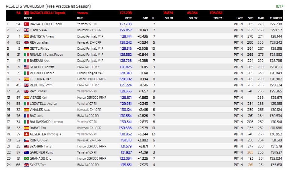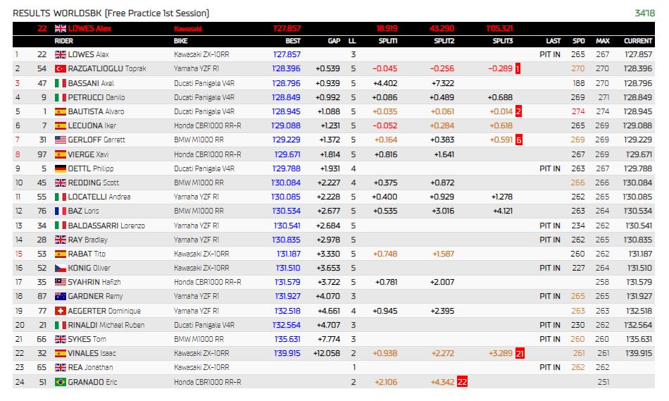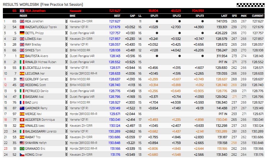11:33 - Fresco di rinnovo con la Kawasaki, è Alex Lowes a settare il primo riferimento della sessione, fermando il cronometro in 1'27"857. Seguono Toprak Razgatlioglu, Axel Bassani e Alvaro Bautista.