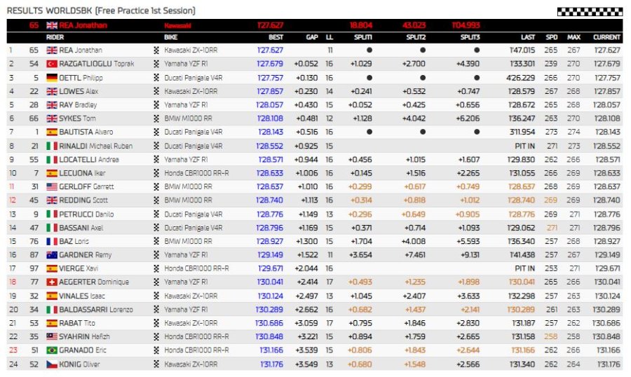 Un ottimo avvio per due dei protagonisti più attesi del sesto Round del Mondiale SBK, seguiti da un sorprendente Phillip Oettl, che ha chiuso la prima fila virtuale delle FP1 con il terzo miglior tempo della mattinata. Più attardata la Panigale ufficiale di Alvaro Bautista, in settima posizione a mezzo secondo da Rea, dietro a un terzetto tutto britannico composto da Alex Lowes, Bradley Ray e Tom Sykes. Chiudono la Top 10 Michael Ruben Rinaldi, Andrea Locatelli e Iker Lecuona.