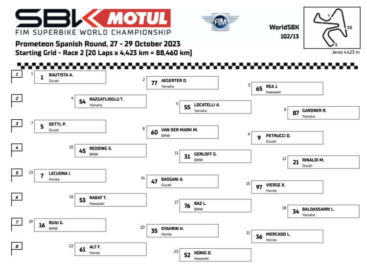 13:55 - Benvenuti alla nostra cronaca LIVE di Gara2 SBK a Jerez. Piloti in griglia, sta per scattare l'ultima gara del mondiale 2023.