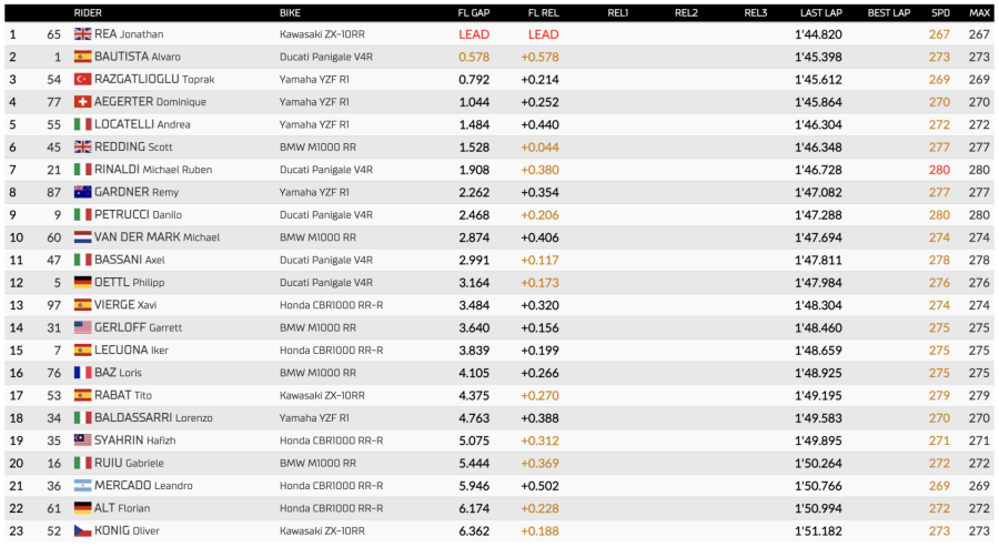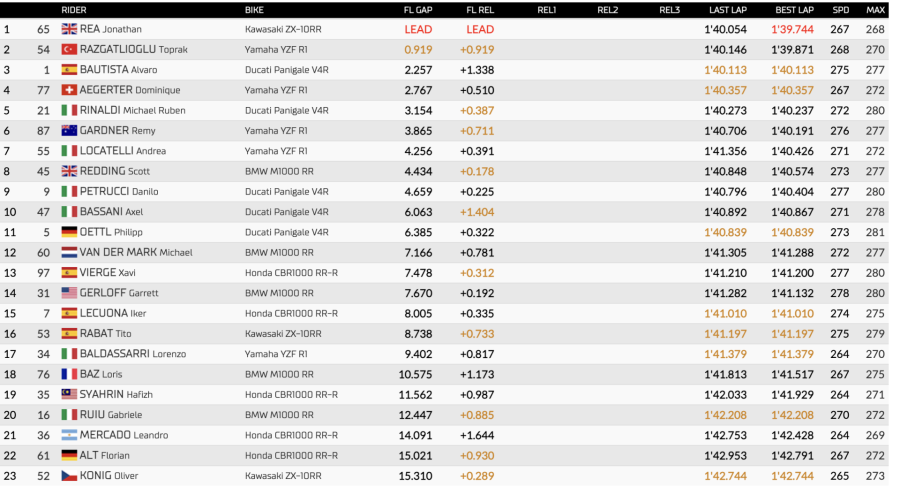 GIRO 2 - La classifica al primo passaggio sul traguardo, con Rea che prende il comando delle operazioni. Toprak affonda su Bautista, che si ritrova 3°.
