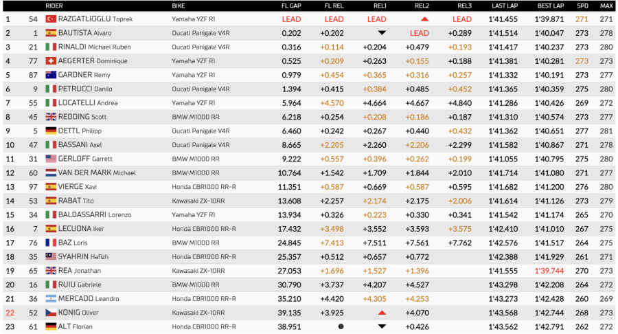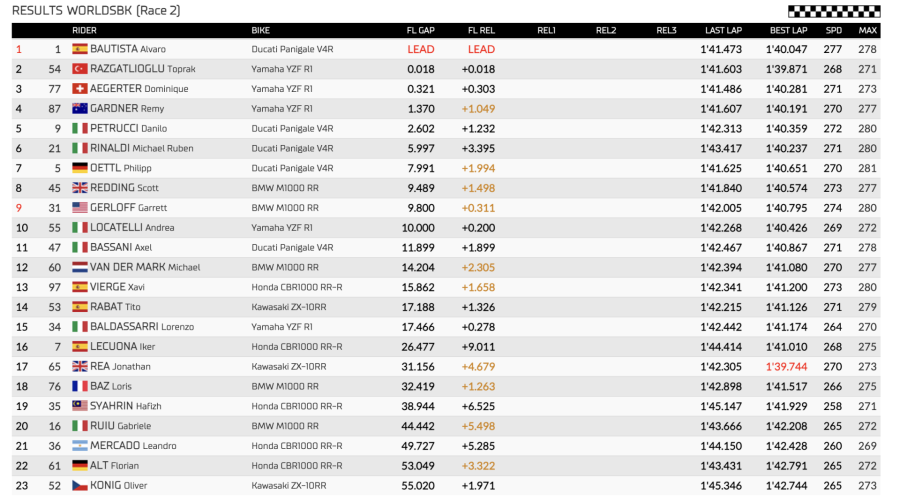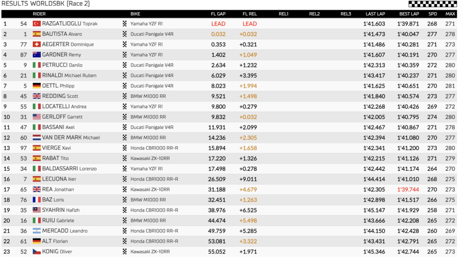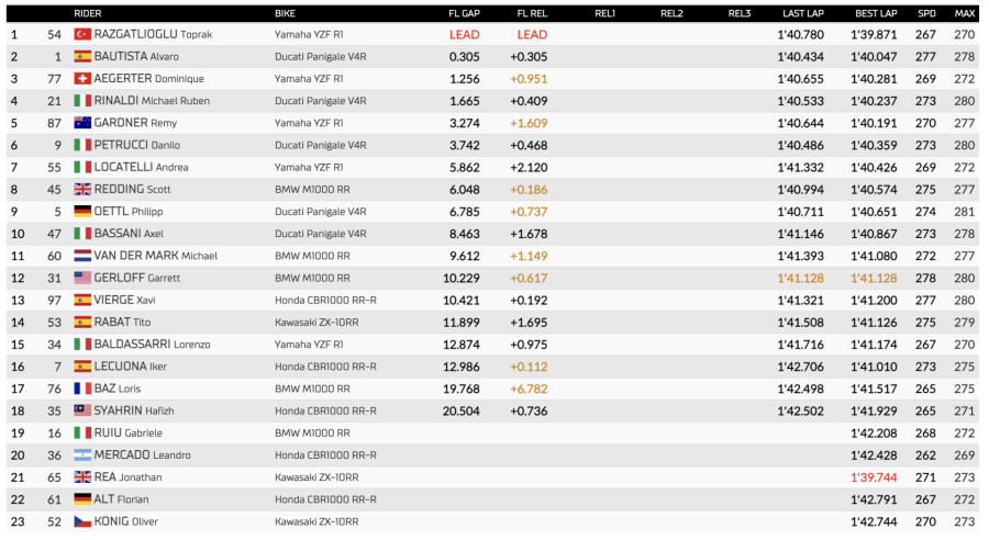 14:36 - La vittoria è assegnata a Bautista, perché Toprak avrebbe superato i limiti della pista ripetutamente nell'ultimo giro. Un vero delitto, il turco meritava la vittoria.