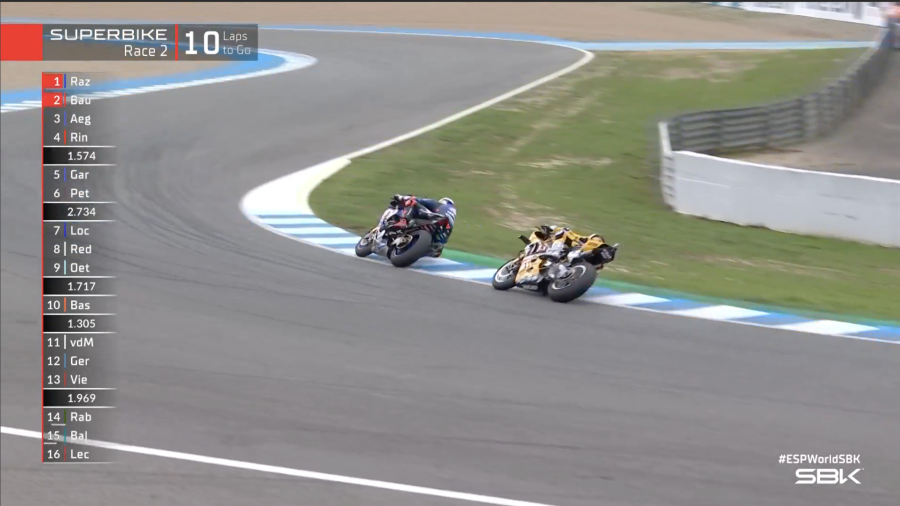 GIRO 9 - Mancano 12 giri e Toprak cerca di tenere a bada un Bautista che si fa sempre più minaccioso. Adesso ci sono solo 7 decimi tra i due, lotta apertissima. Rinaldi intanto si porta a 1,8 secondi da Toprak ed a 3 decimi da Aegerter.