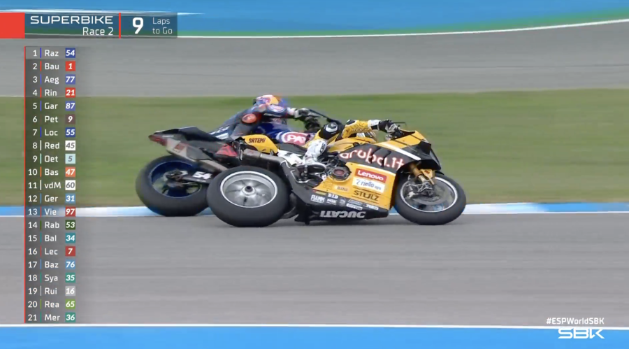 13:55 - Non è stato di certo un fine settimana entusiasmante per Bassani, steso sia in gara1 che in Superpole race da un rivale! Speriamo che almeno oggi non abbia problemi in gara
