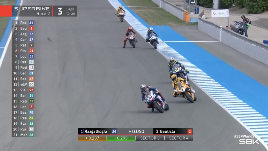 GIRO 1 - Si spegne il semaforo verde, scatta Gara2 e si infila Bautista davanti a tutti alla prima staccata!Secondo Rea, poi Toprak ed Aegerter. Locatelli 5° su Redding e Van Der Mark. Rea passa Bautista!