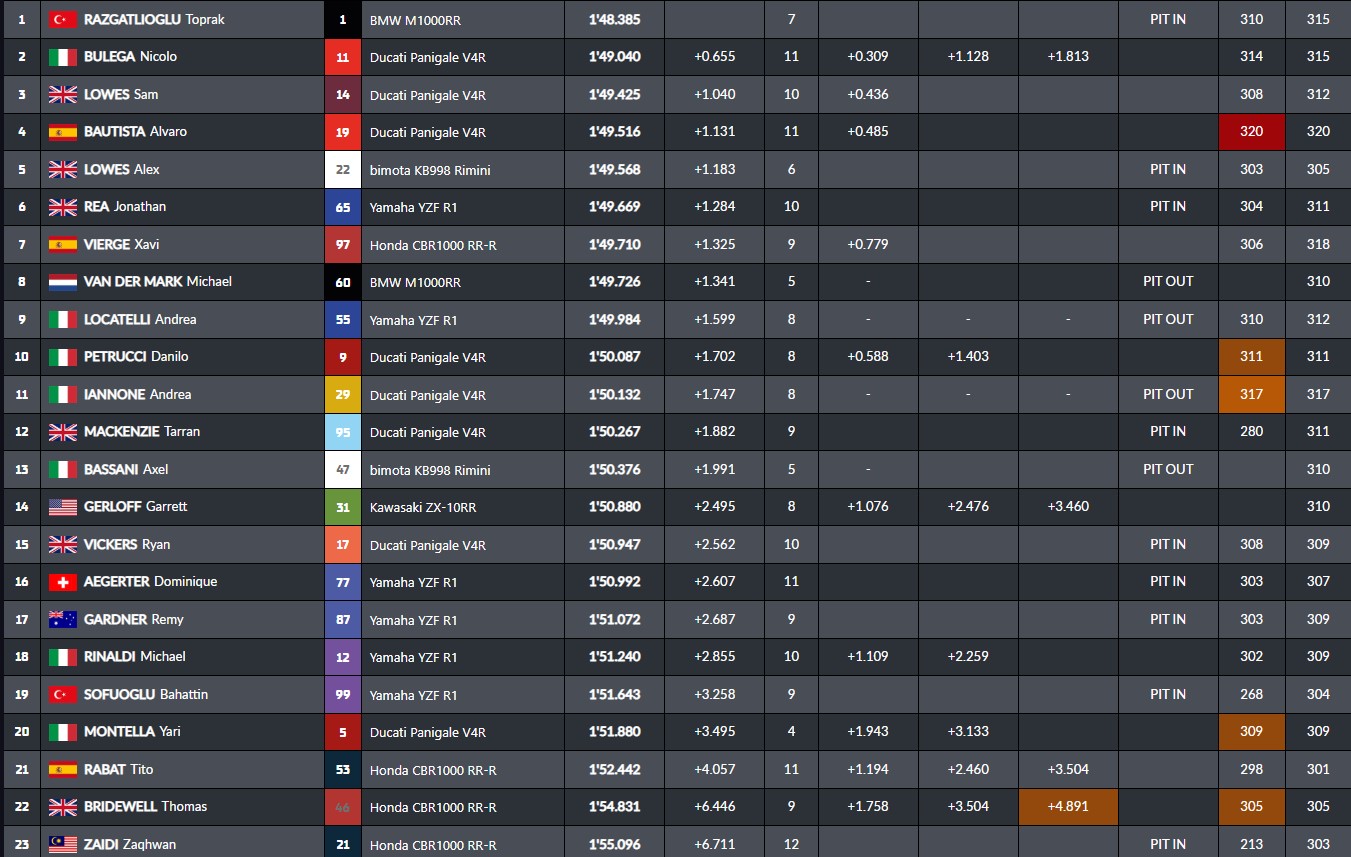 10:50 Toprak Razgatlioglu manda il primo segnale chiaro alla concorrenza: 1'48"719! Bulega e la Ducati incassano tre decimi dal turco mentre Sam Lowes è terzo a sette decimi.