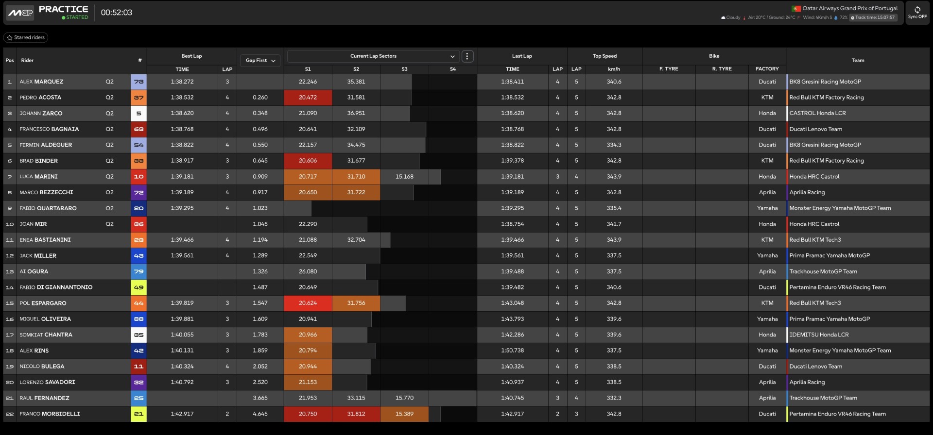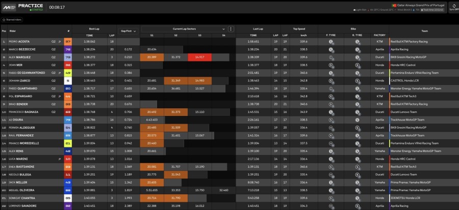 17.00 - Ultimi giri lanciati: Quartararo da tutto se stesso ma non basta a trovare la Q2. Giro veloce incredibile di Bagnaia che si porta 2° a 30 millesimi da Alex Marquez. Buona prova anche per l'Aprilia di Bezzecchi 4° dietro ad Acosta 3°.