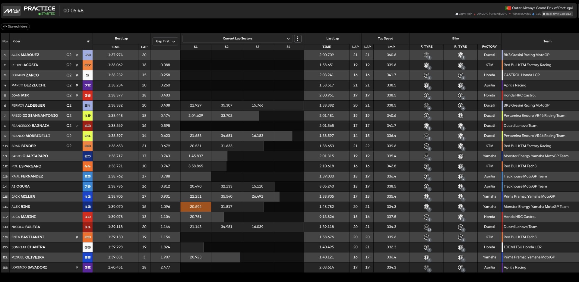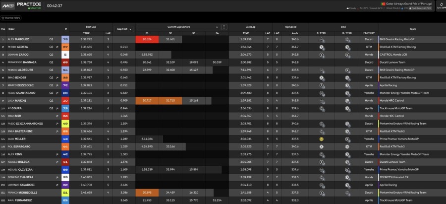 16.36 - Anche Alex Marquez monta una dura all'anteriore, dopo aver segnato il tempo con una coppia di medie. La seconda miglior Ducati è quella di Bagnaia 5°, a pochi centesimi da Aldeguer 6°. Bene anche la KTM che al momento vedrebbe passare tre piloti.