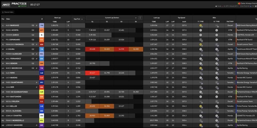 Bezzecchi si è confermato in forma sulla Aprilia che qui nel 2024 con Vinales andò fortissimo, la Honda ha piazzato tre moto in top ten. Nicolò Bulega è stato protagonista di un ottimo debutto, chiudendo la sessione in 14a posizione in crescendo. Ha fatto peggio Pecco Bagnaia, solo 17° a fine turno.