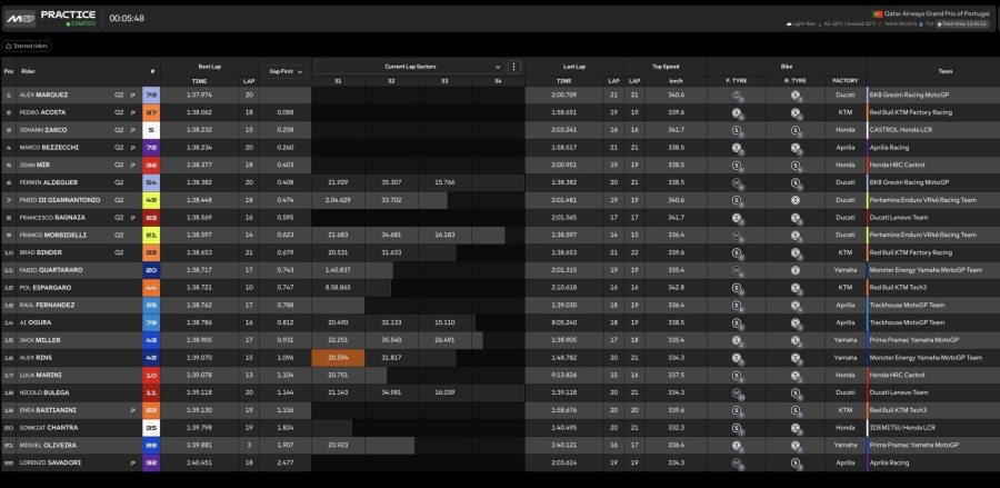 La prima sessione di libere sul tracciato di Portimao ha visto Alex Marquez dettare il passo, ma ha anche mostrato quanto equilibrio ci possa essere in questo fine settimana, visto che le prime 5 posizioni della classifica della FP1 sono occupate dai 5 diversi Costruttori in pista. Non sembra insomma che ci possa essere il dominio di una moto piuttosto che di un'altra, il che rende questo fine settimana particolarmente interessante.
