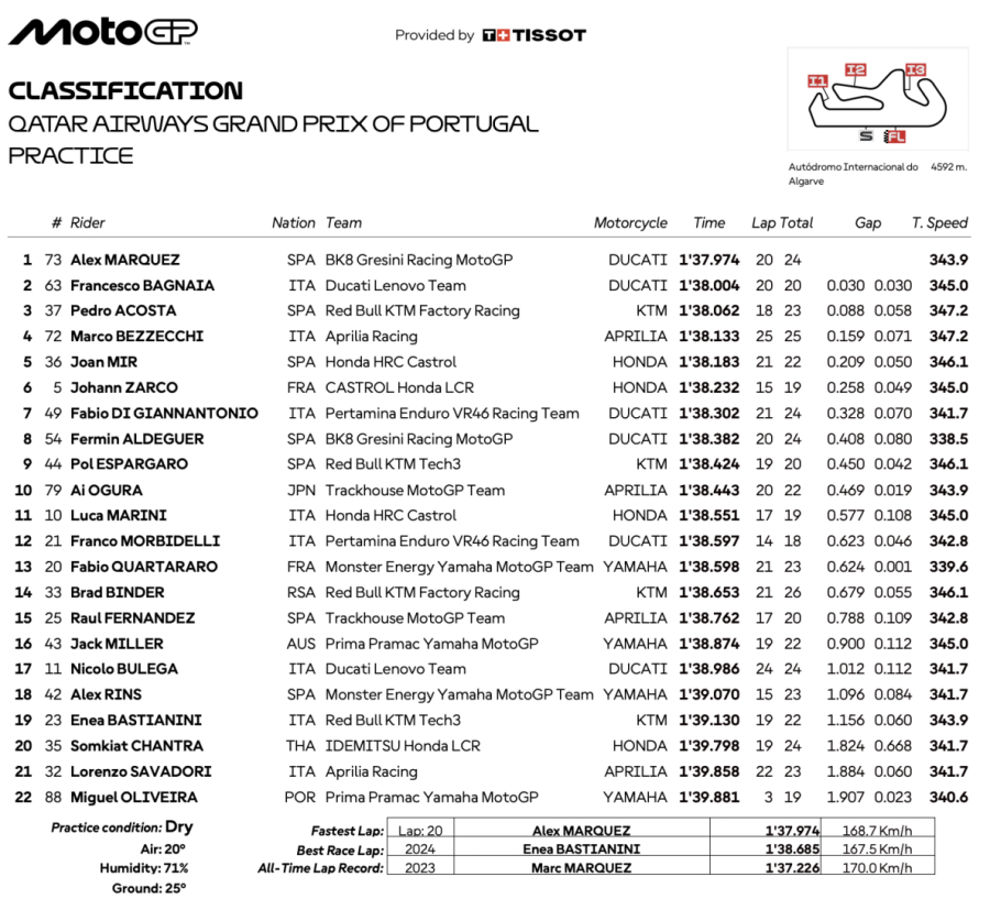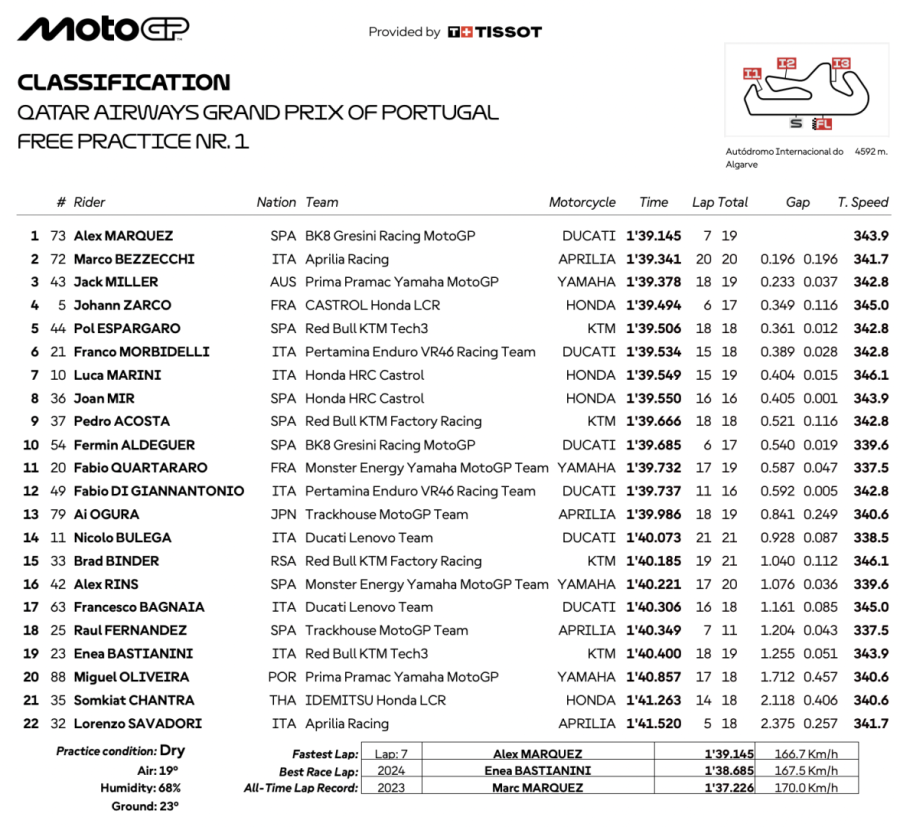 Questa la classifica della prima sessione di libere a Portimao