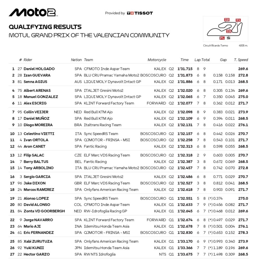 I due rivali saranno divisi in griglia da Alex Escrig, Collin Veijer e Dani Munoz, mentre Arenas partirà dalla quarta casella. Per quanto riguarda i piloti italiani, Celestino Vietti aprirà la quarta fila, affiancato da Ivan Ortolà e Aron Canet, mentre Tony Arbolino non è andato oltre il 15° posto. Tutta in salita anche la gara di David Alonso, che partirà 20° dopo essere stato eliminato in Q1.